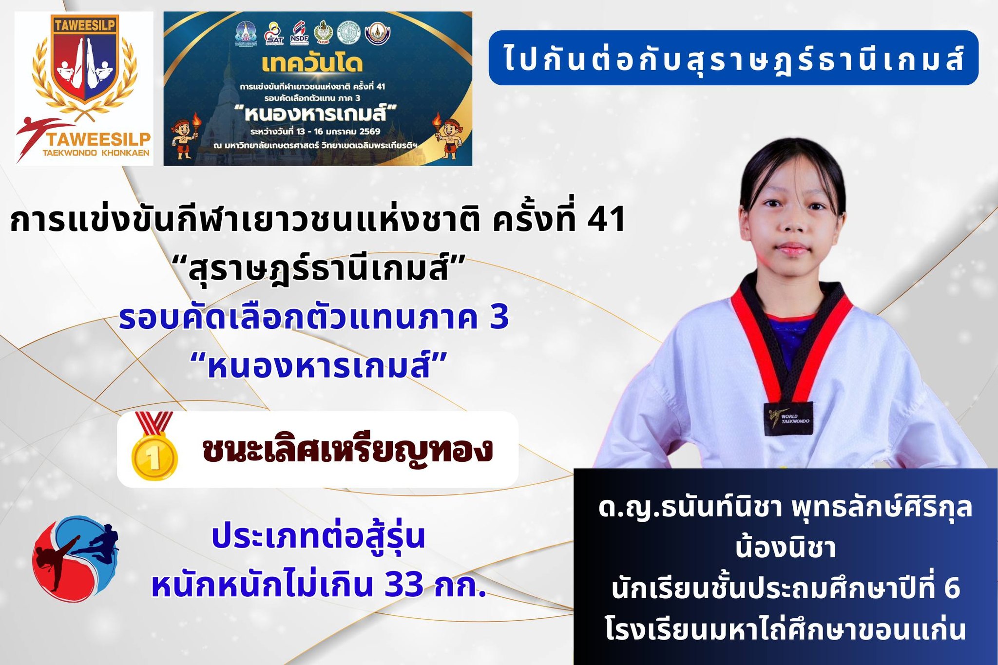 ไปแข่งขันระดับประเทศ ”สุราษฎร์ธานีเกมส์“ ประเภทกีฬาเทควันโด ยุวชนหญิงรุ่นน้ำหนักไม่เกิน 33 kg.